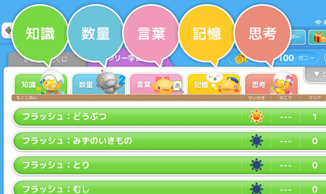 知識、数量、言葉、記憶、思考の5系統59ジャンル、ひらがな、カタカナ、数、時計、図形、比較、朗読、百人一首などを収録。どれでも好きなものがいつでも使え、知的好奇心をくすぐります。